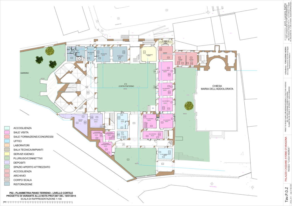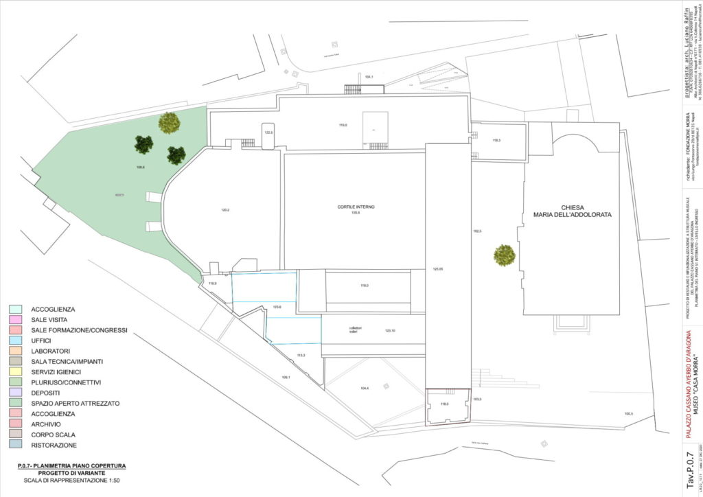 La congregazione delle Serve di Maria Addolorata – fondata nel 1874 e aggregata nel 1880 all’Ordine dei Serviti, della quale faceva appunto parte Suor Teresa de Conciliis – probabilmente risiedeva all’interno del palazzo già dall’epoca della morte della monaca (avvenuta nel 1863), e collaborò attivamente alla costruzione della chiesa dell’Addolorata. L’edificio religioso – realizzato nell’area adiacente al palazzo originariamente destinata a giardino – fu sicuramente costruito prima del 1880, anno di pubblicazione della Pianta del Comune di Napoli, nella quale appunto è già rappresentata la chiesa.