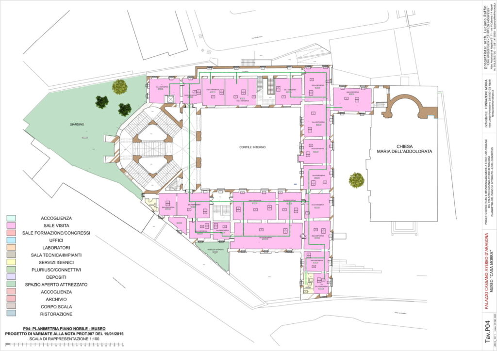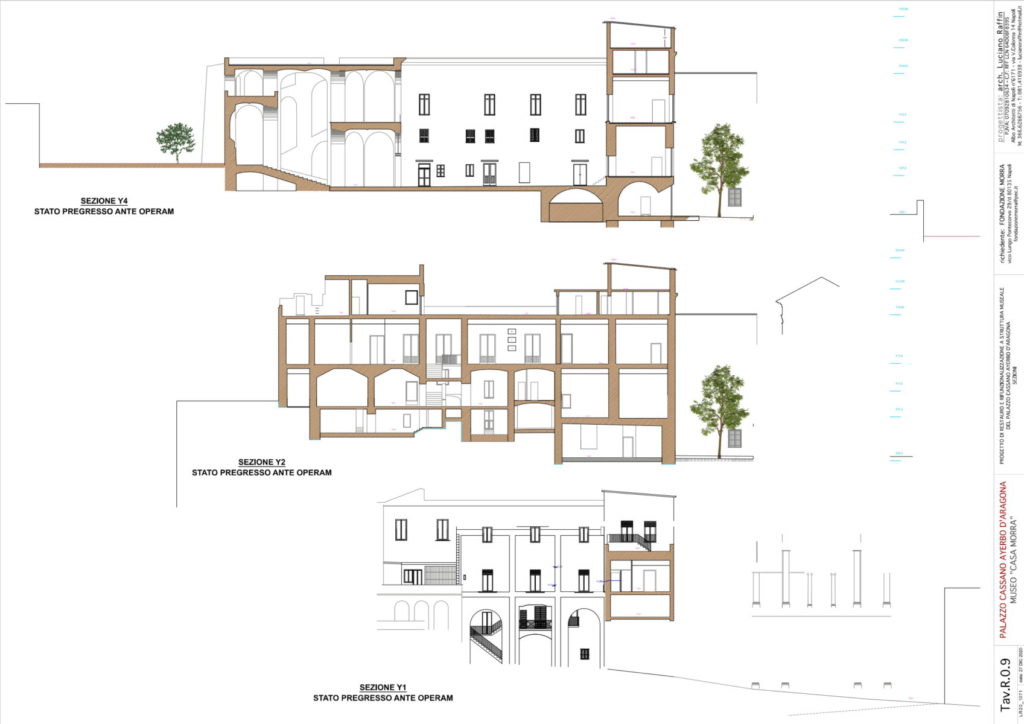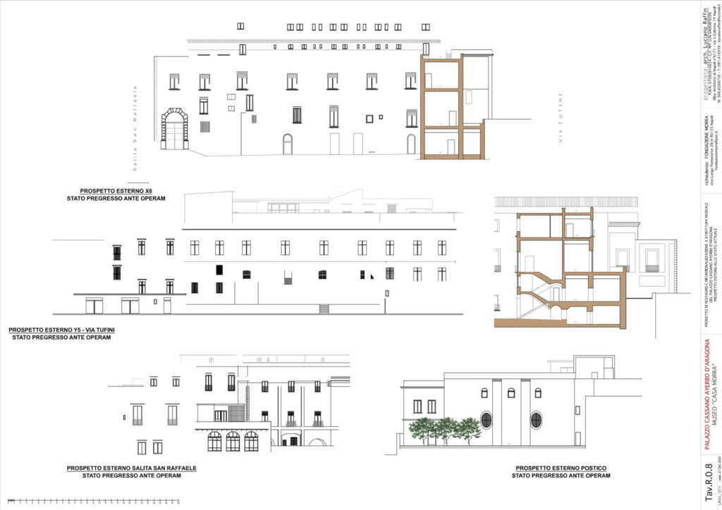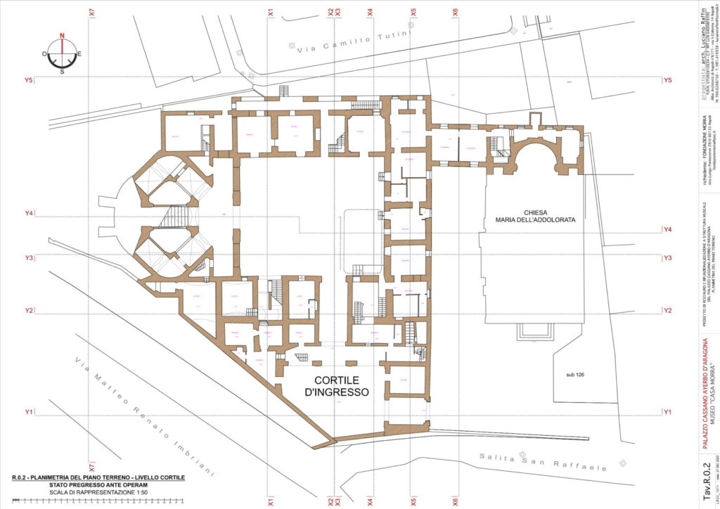 La prima notizia dell’ampliamento del palazzo risale al 1732, quando furono pagati a un tale D. Giuseppe Cito 39 ducati «per delli soffitti, di tele e loro finimento e pittura fatti nelle due stanze e gabinetto del quarto nuovo del palazzo del Principe di Cassano». Accanto al nucleo originario costituito dall’antica masseria cinquecentesca, veniva realizzato quindi, nel terzo decennio del Settecento, un ampio cortile rettangolare intorno al quale si sviluppava, sul lato meridionale, la fabbrica preesistente. I nuovi corpi di fabbrica erano organizzati a forma di “C” intorno al cortile, lasciando il quarto lato libero sul giardino. L’edificio era dotato anche di cisterne, se nel 1748 da questi ambienti veniva «tirata l’acqua» utile alla costruzione di «muri, lamie, archi per la formazione della nuova scala». Intorno alla metà del XVIII secolo, infatti, proprio sul lato lasciato aperto sul giardino, veniva aggiunto il monumentale corpo scala a pianta ottagonale, già documentato nella mappa del Duca di Noja, il cui rilievo topografico risale appunto al 1750. Lo scalone, a cinque rampe, è realizzato su volte a crociera rampanti in tufo, impostate sui pilastri centrali e sulle murature laterali in conci di tufo. La prima rampa centrale conduce a un pianerottolo a pianta composta, ottenuta da un rettangolo centrale e da due archi di cerchio laterali di raccordo, da cui partono, sui due lati, le coppie di rampe simmetriche (intervallate da un altro pianerottolo ad arco di cerchio), che conducono al piano superiore.